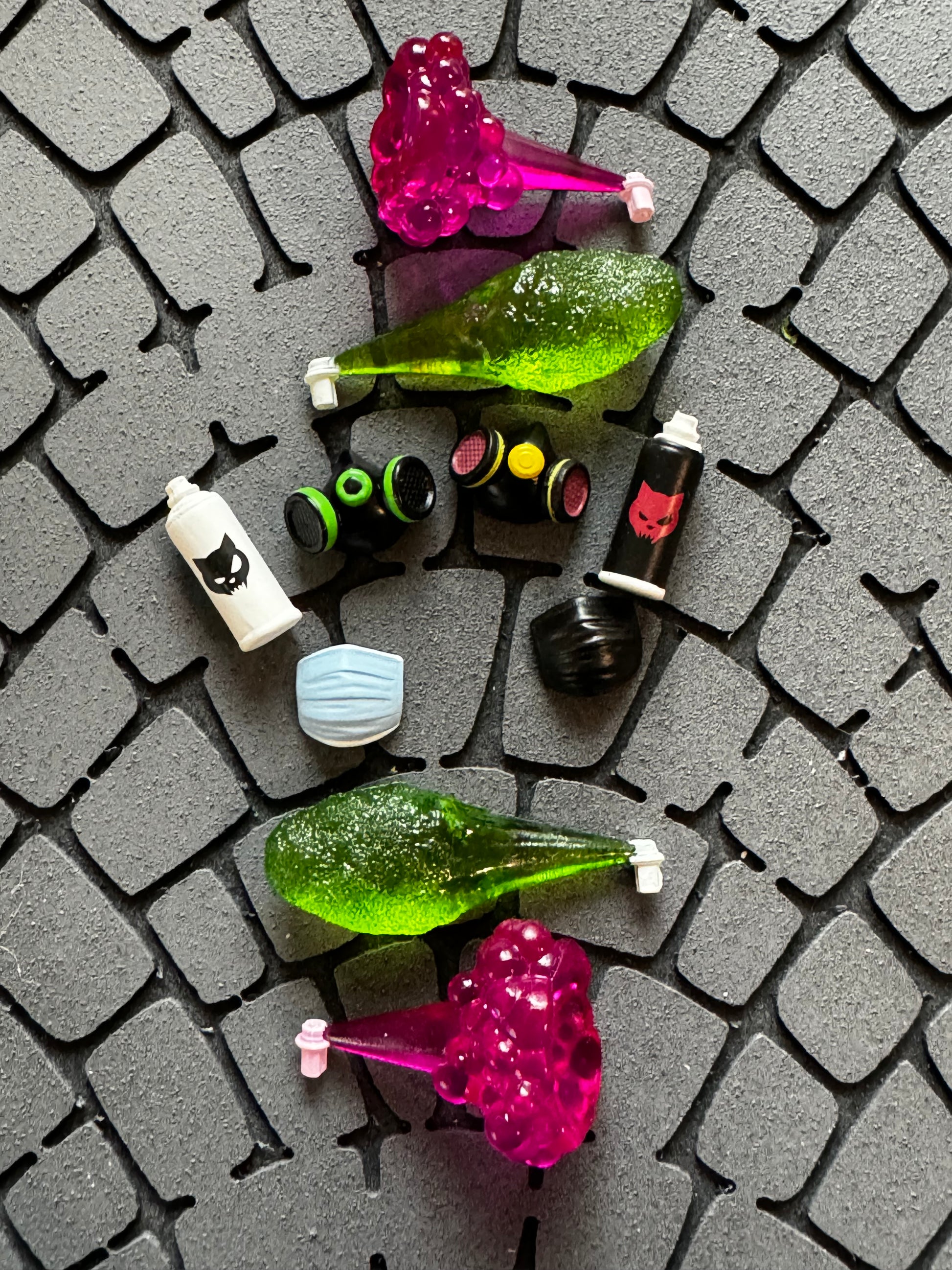 This breakout set includes two spray cans (nozzles have been pre-removed for ease), two green spray effects, two pink spray effects, two respirator masks and two face masks. The nozzles can be removed from the spray cans and replaced with the spray effects.