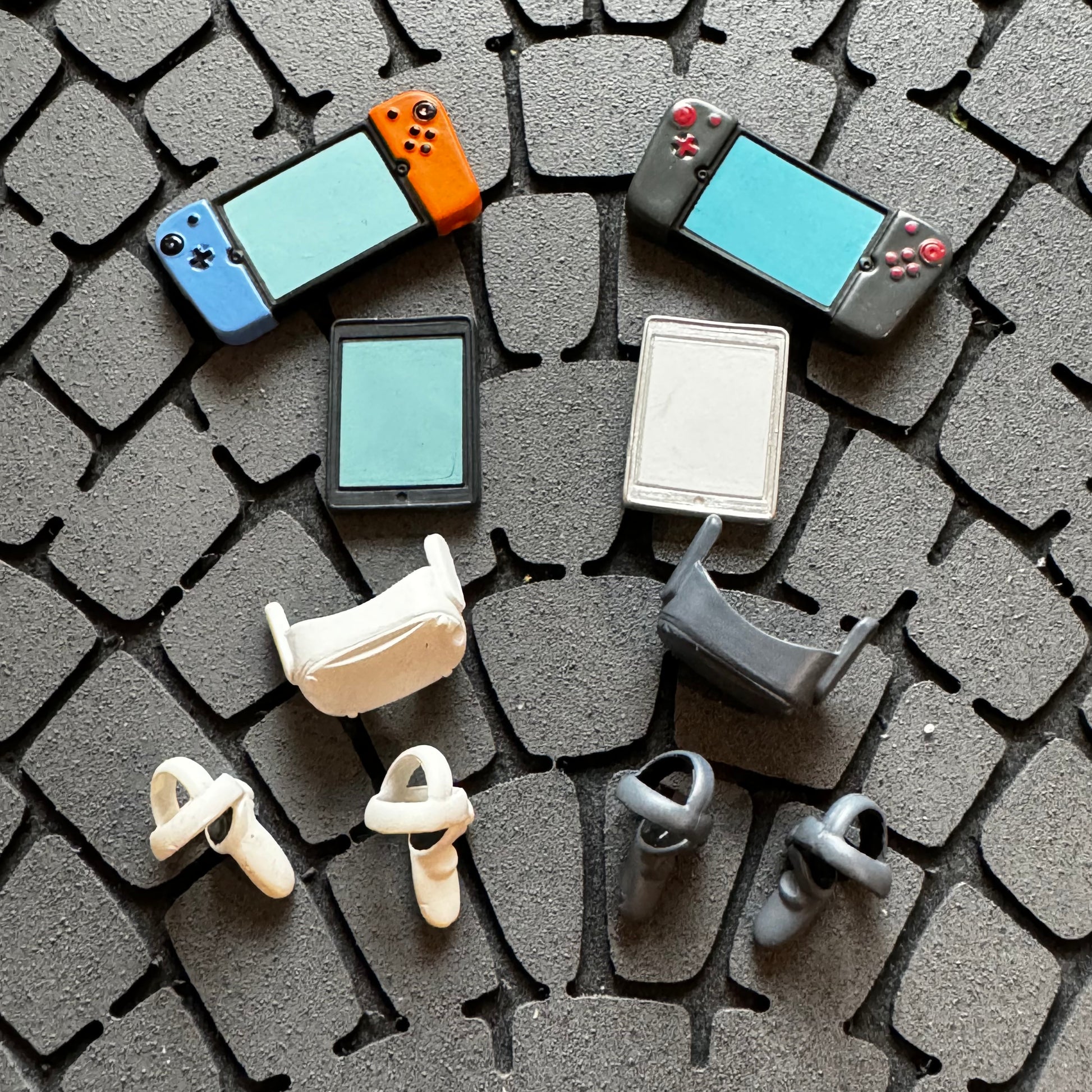 This breakout set includes two handheld game systems, two tablet computers, and two VR headsets with left and right controllers.