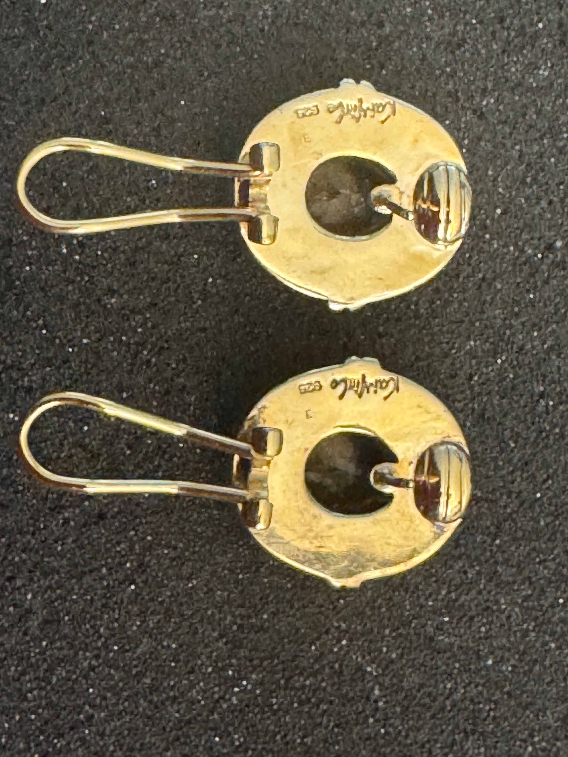 Vintage Kai Yin Lo Earrings showcase the designer's signature craftsmanship with lustrous mother of pearl and radiant yellow citrine stones set in vermeil gold over sterling silver. This authenticated signed piece exemplifies the refined aesthetic that defined Kai Yin Lo's celebrated jewelry collections.